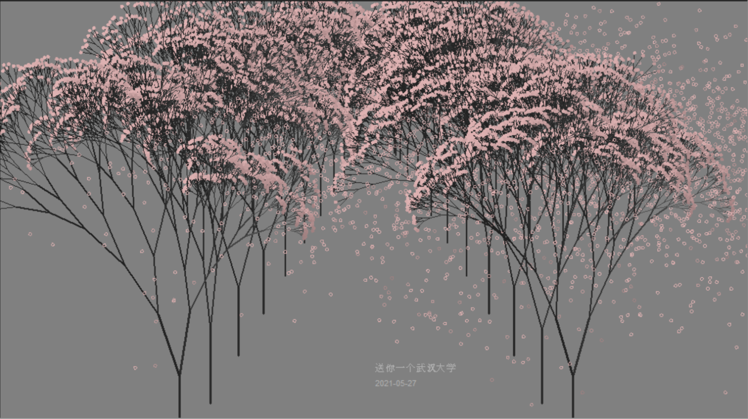 画树的函数是现成的,我只需要安排两排花树的位置:近大远小,用抛物线来确定各樱花树的位置。以及,远处的树反正看不清,树枝层数也不需要那么多了,节约资源。