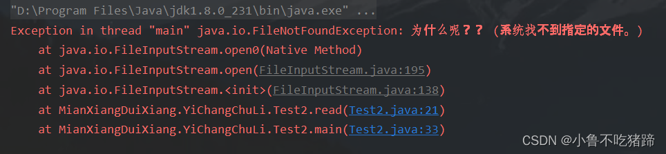 public class Test2 {public static void read() throws Exception {//[throws Exception <--可能抛出异常↓]/表示当前这个方法会扔出来Exception这样的错误InputStream is = new FileInputStream(new File("为什么呢??"));}public static void main(String[] args) throws Exception {read();}