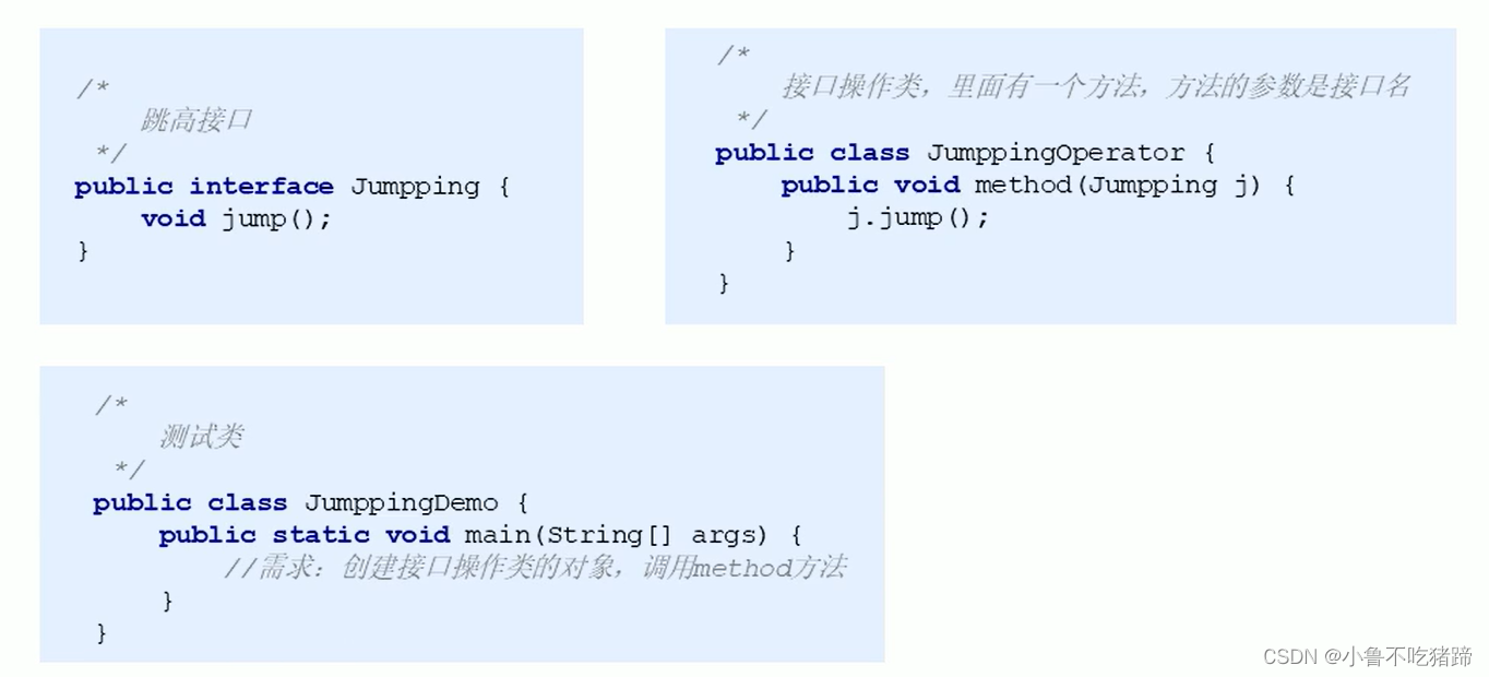public class JumppingOperator {public void method(Jumpping jumpping) {//需要的是该接口的实现类对象//所以创建一个类Catjumpping.jump();}