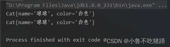package MianXiangDuiXiang.ToString;public class Cat {String name;String color;public Cat(String name, String color) {this.name = name;this.color = color;}//子类对父类提供的方法不满意可以重写@Overridepublic String toString() {//return里面的内容可以自己写//用软件自带的更直观return "Cat{" +"name='" + name + '\'' +", color='" + color + '\'' +'}';}public static void main(String[] args) {Cat c = new Cat("球球", "白色");//直接打印cSystem.out.println(c);//默认打印对象,自动执行这个对象中的tostring()方法System.out.println(c.toString());//tostring()-->默认的是包.类@内存地址}