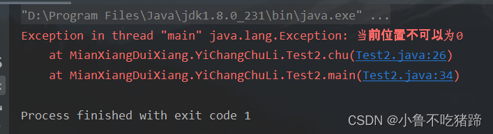 public class Test2 {public static void chu(int a, int b) throws Exception {//告诉外面我要仍出来一个错误if (b == 0) {//如果b=0,抛出如下错误throw new Exception("当前位置不可以为0");//真正抛出来一个异常} else {System.out.println(a / b);}}public static void main(String[] args) throws Exception {chu(5, 0);}