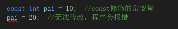 注意:上面例子上的pai被称为const修饰的常变量,const修饰的常变量在C语言中只是在语法层面限制了变量pai不能直接被改变,但是pai本质上还是一个变量,所以才叫做常变量。
