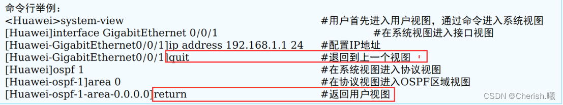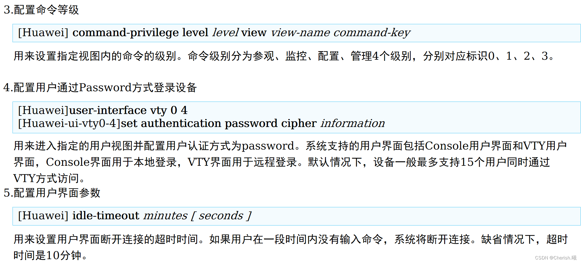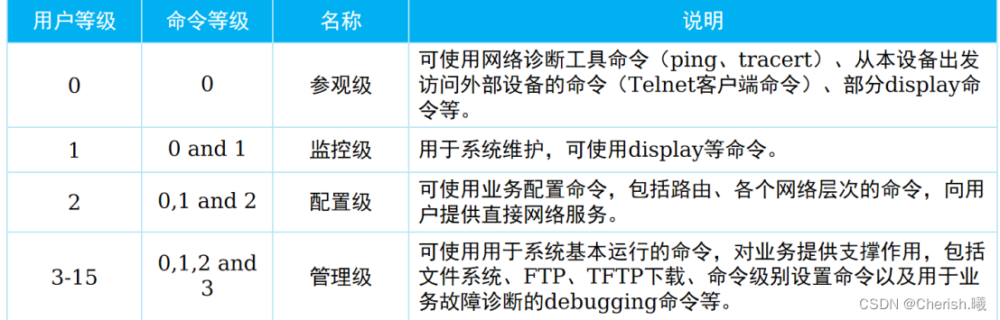[Huawei] command-privilege level level view view-name command-key 用来设置指定视图内的命令的级别。命令级别分为参观、监控、配置、管理4个级别,分别对应标识0、1、2、3。
