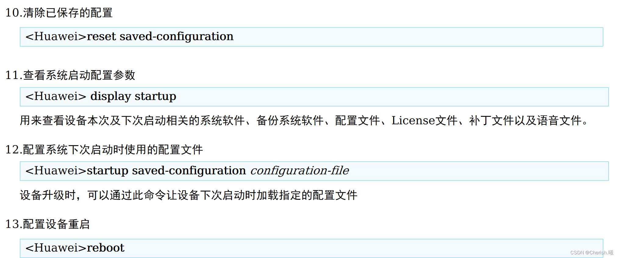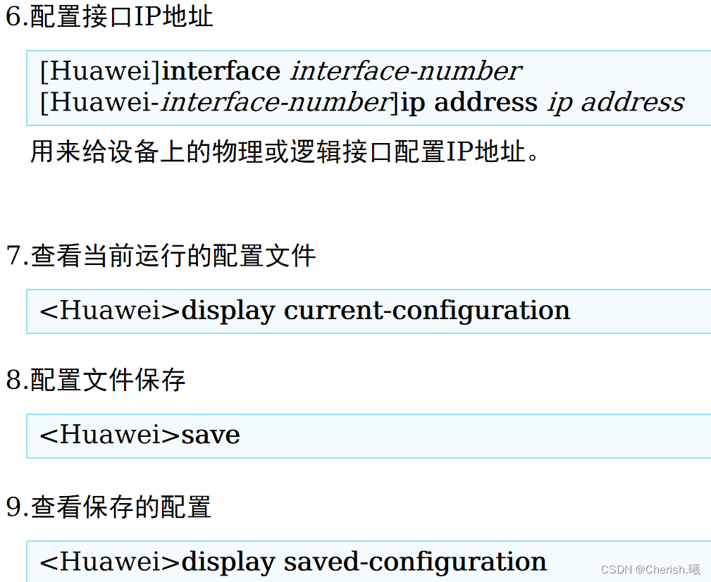 display current-configuration 查看当前设备在内存中所有的生效文件,所有的配置命令都在该文件中,断电后,该文件失效。