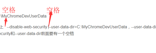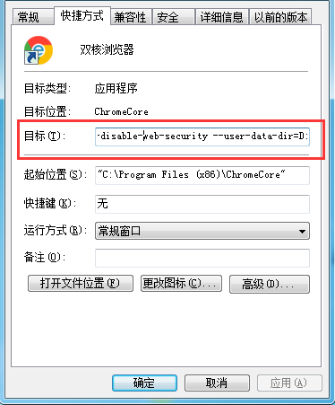 ②浏览器属性页面中的目标输入框里加上 --disable-web-security --user-data-dir=C:\MyChromeDevUserData,--user-data-dir的值就是刚才新建的目录。--disable-web-security和--user-data-dir前面要有一个空格