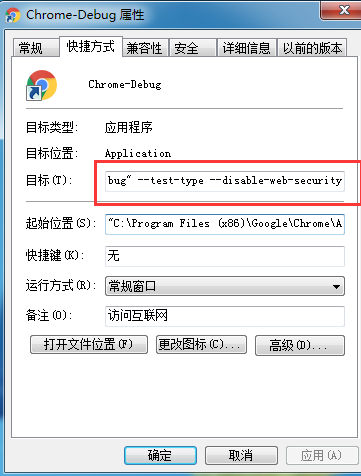 ②浏览器属性页面中的目标输入框里加上 --test-type --disable-web-security的值就是刚才新建的目录。--test-type和--disable-web-security前面要有一个空格