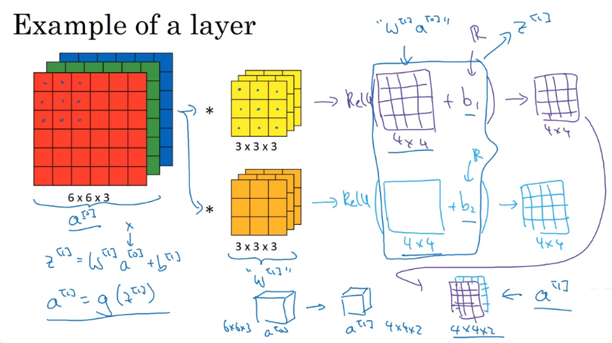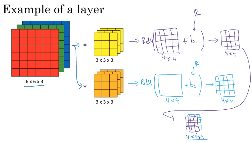 上节课,我们已经讲了如何通过两个过滤器卷积处理一个三维图像,并输出两个不同的4×4矩阵。假设使用第一个过滤器进行卷积,得到第一个4×4矩阵。使用第二个过滤器进行卷积得到另外一个4×4矩阵。最终各自形成一个卷积神经网络层,然后增加偏差,它是一个实数,通过Python的广播机制给这16个元素都加上同一偏差。然后应用非线性函数,为了说明,它是一个非线性激活函数ReLU,输出结果是一个4×4矩阵。