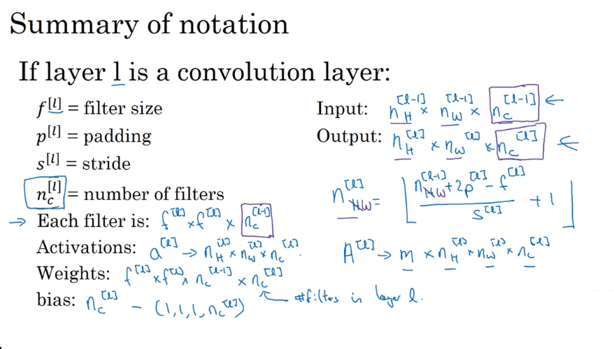这一层的输入会是某个维度的数据,表示为 n×n×n_c ,n_c表示某层上的颜色通道数。我们要稍作修改,增加上标[l-1],