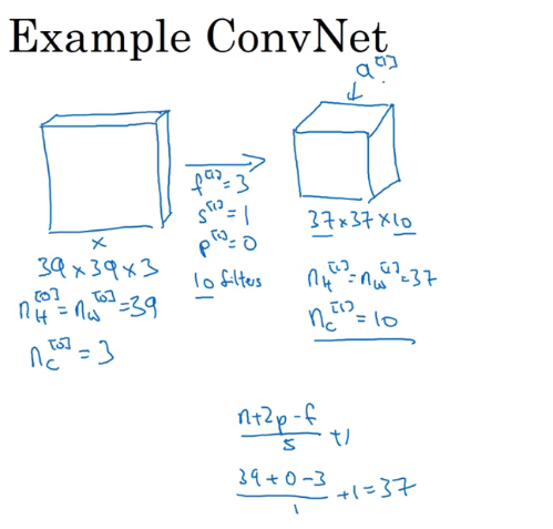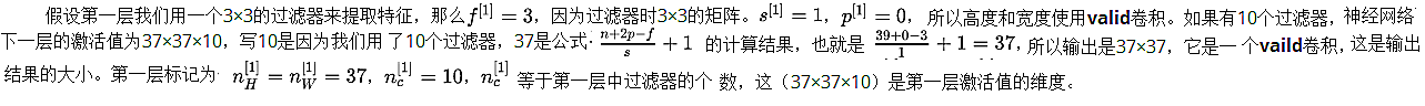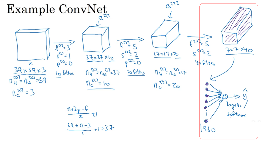 ,计算过程我跳过了,最后输出为7×7×40,假设使用了40个过滤器。padding为0,40个过滤器,最后结果为7×7×40。到此,这张39×39×3的输入图像就处理完毕了,为图片提取了7×7×40个特征。