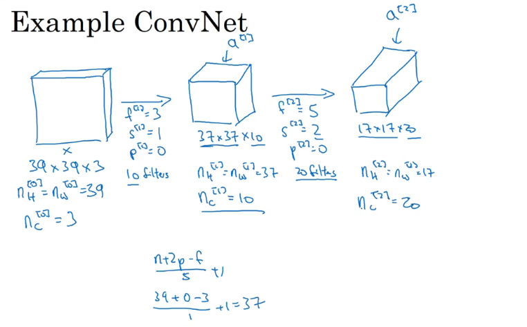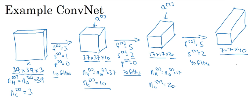 这是卷积神经网络的一个典型范例,设计卷积神经网络时,确定这些超参数比较费工夫。要决定过滤器的大小、步幅、padding以及使用多少个过滤器。这节课要掌握的一点是,随着神经网络计算深度不断加深,通常开始时的图像也要更大一些,初始值为39×39,高度和宽度会在一段时间内保持一致,然后随着网络深度的加深而逐渐减小,从39到37,再到17,最后到7。而通道数量在增加,从3到10,再到20,最后到40。在许多其它卷积神经网络中,你也可以看到这种趋势。关于如何确定这些参数,后面课上我会更详细讲解,这是我们讲的第一个卷积神经网络示例。