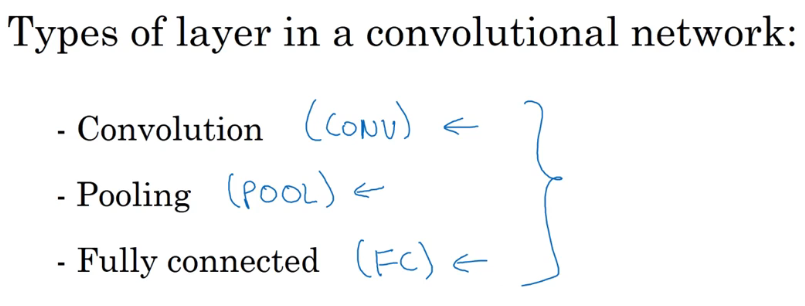 一个典型的卷积神经网络通常有三层,一个是卷积层,我们常常用Conv来标注。上一个例子,我用的就是CONV。还有两种常见类型的层,我们留在后两节课讲。一个是池化层,我们称之为POOL。最后一个是全连接层,用FC表示。虽然仅用卷积层也有可能构建出很好的神经网络,但大部分神经望楼架构师依然会添加池化层和全连接层。幸运的是,池化层和全连接层比卷积层更容易设计。后两节课我们会快速讲解这两个概念以便你更好的了解神经网络中最常用的这几种层,你就可以利用它们构建更强大的网络了。