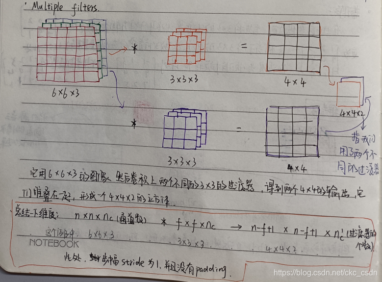 示例中我们有两个过滤器,也就是有两个特征,因此我们才最终得到一个4×4×2的输出。但如果我们用了10个过滤器,而不是2个,我们最后会得到一个4×4×10维度的输出图像,因为我们选取了其中10个特征映射,而不仅仅是2个,将它们堆叠在一起,形成一个4×4×10的输出图像,也就是