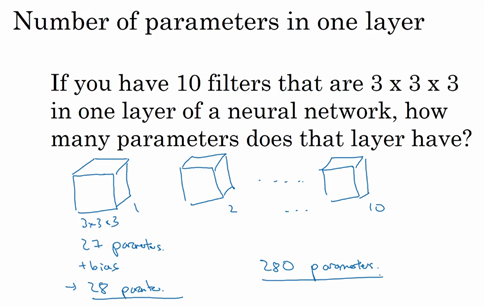 为了加深理解,我们来做一个练习。假设你有10个过滤器,而不是2个,神经网络的一层是3×3×3,那么,这一层有多少个参数呢?我们来计算一下,每一层都是一个3×3×3的矩阵,因此每个过滤器有27个参数,也就是27个数。然后加上一个偏差,用参数b表示,现在参数增加到28个。上一页幻灯片里我画了2个过滤器,而现在我们有10个,加在一起是28×10,也就是280个参数。