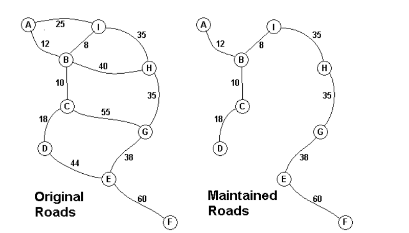 The Head Elder of the tropical island of Lagrishan has a problem. A burst of foreign aid money was spent on extra roads between villages some years ago. But the jungle overtakes roads relentlessly, so the large road network is too expensive to maintain. The Council of Elders must choose to stop maintaining some roads. The map above on the left shows all the roads in use now and the cost in aacms per month to maintain them. Of course there needs to be some way to get between all the villages on maintained roads, even if the route is not as short as before. The Chief Elder would like to tell the Council of Elders what would be the smallest amount they could spend in aacms per month to maintain roads that would connect all the villages. The villages are labeled A through I in the maps above. The map on the right shows the roads that could be maintained most cheaply, for 216 aacms per month. Your task is to write a program that will solve such problems.