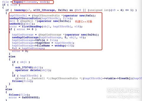 初看之下发现是一个典型的C++代码,应该是windows代码移置到移动app中的,虚函数比较多,因此流程的查看比较麻烦,先是动态调试,有一定的反调试功能,但都比较弱,很容易解决,后面跟踪发觉这个office文档中元素种类很多,读写文件操作也都封装在VTable中,跟踪有点让人眼花。通过断点fopen找到了hwp文件打开的位置: