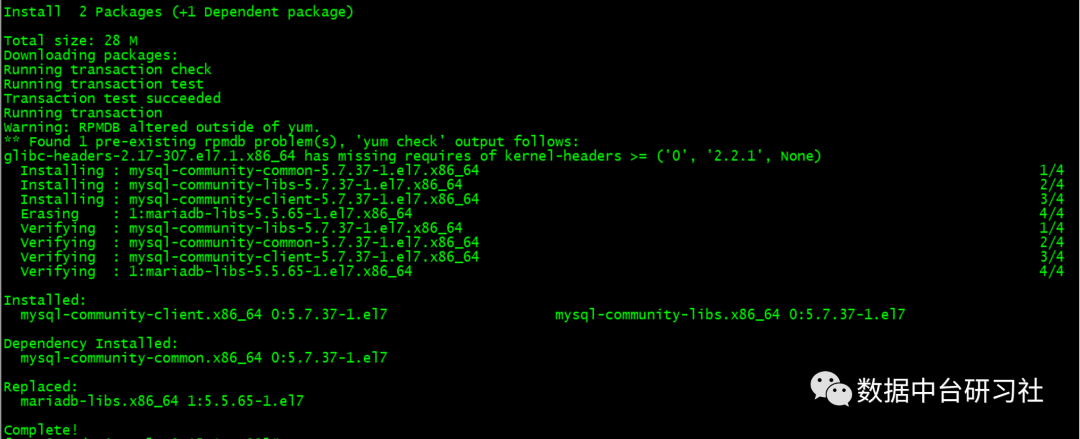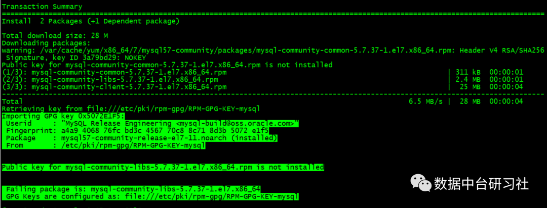 安装过程出现了意外,大概看了一下,是由于签名不通过,导致无法安装。百度了一下,命令改成“yum install mysql-community-client.x86_64 -y --nogpgcheck”,也就是不检查依赖了,于是顺利安装成功。