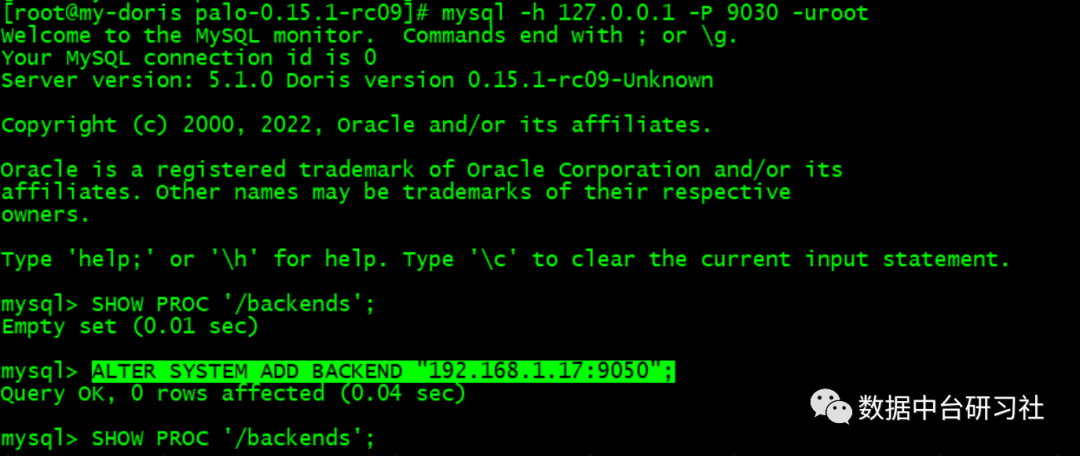 #连上be的命令mysql -h 127.0.0.1 -P 9030 -uroot#添加fe的配置ALTER SYSTEM ADD BACKEND "192.168.1.17:9050";#查看后台任务SHOW PROC '/backends';