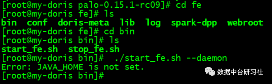 JAVA的配置过程是基本功,这个就不赘述了。重新执行 ./start_fe.sh --daemon 命令,启动成功。