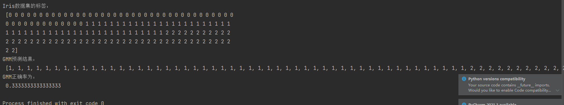 os.environ['QT_QPA_PLATFORM_PLUGIN_PATH'] = plugin_pathclass GMM:def __init__(self,Data,K,weights = None,means = None,covars = None):"""这是GMM(高斯混合模型)类的构造函数:param Data: 训练数据:param K: 高斯分布的个数:param weigths: 每个高斯分布的初始概率(权重):param means: 高斯分布的均值向量:param covars: 高斯分布的协方差矩阵集合"""self.Data = Dataself.K = Kif weights is not None:self.weights = weightselse:self.weights = np.random.rand(self.K)self.weights /= np.sum(self.weights) # 归一化col = np.shape(self.Data)[1]if means is not None:self.means = meanselse:self.means = []for i in range(self.K):mean = np.random.rand(col)#mean = mean / np.sum(mean) # 归一化self.means.append(mean)if covars is not None:self.covars = covarselse:self.covars = []for i in range(self.K):cov = np.random.rand(col,col)#cov = cov / np.sum(cov) # 归一化self.covars.append(cov) # cov是np.array,但是self.covars是listdef Gaussian(self,x,mean,cov):"""这是自定义的高斯分布概率密度函数:param x: 输入数据:param mean: 均值数组:param cov: 协方差矩阵:return: x的概率"""dim = np.shape(cov)[0]# cov的行列式为零时的措施covdet = np.linalg.det(cov + np.eye(dim) * 0.001)covinv = np.linalg.inv(cov + np.eye(dim) * 0.001)xdiff = (x - mean).reshape((1,dim))# 概率密度prob = 1.0/(np.power(np.power(2*np.pi,dim)*np.abs(covdet),0.5))*\np.exp(-0.5*xdiff.dot(covinv).dot(xdiff.T))[0][0]return probdef GMM_EM(self):"""这是利用EM算法进行优化GMM参数的函数:return: 返回各组数据的属于每个分类的概率"""loglikelyhood = 0oldloglikelyhood = 1len,dim = np.shape(self.Data)# gamma表示第n个样本属于第k个混合高斯的概率gammas = [np.zeros(self.K) for i in range(len)]while np.abs(loglikelyhood-oldloglikelyhood) > 0.00000001:oldloglikelyhood = loglikelyhood# E-stepfor n in range(len):# respons是GMM的EM算法中的权重w,即后验概率respons = [self.weights[k] * self.Gaussian(self.Data[n], self.means[k], self.covars[k])for k in range(self.K)]respons = np.array(respons)sum_respons = np.sum(respons)gammas[n] = respons/sum_respons# M-stepfor k in range(self.K):#nk表示N个样本中有多少属于第k个高斯nk = np.sum([gammas[n][k] for n in range(len)])# 更新每个高斯分布的概率self.weights[k] = 1.0 * nk / len# 更新高斯分布的均值self.means[k] = (1.0/nk) * np.sum([gammas[n][k] * self.Data[n] for n in range(len)], axis=0)xdiffs = self.Data - self.means[k]# 更新高斯分布的协方差矩阵self.covars[k] = (1.0/nk)*np.sum([gammas[n][k]*xdiffs[n].reshape((dim,1)).dot(xdiffs[n].reshape((1,dim))) for n in range(len)],axis=0)loglikelyhood = []for n in range(len):tmp = [np.sum(self.weights[k]*self.Gaussian(self.Data[n],self.means[k],self.covars[k])) for k in range(self.K)]tmp = np.log(np.array(tmp))loglikelyhood.append(list(tmp))loglikelyhood = np.sum(loglikelyhood)for i in range(len):gammas[i] = gammas[i]/np.sum(gammas[i])self.posibility = gammasself.prediction = [np.argmax(gammas[i]) for i in range(len)]def run_main():"""这是主函数"""# 导入Iris数据集iris = load_iris()label = np.array(iris.target)data = np.array(iris.data)print("Iris数据集的标签:\n",label)# 对数据进行预处理data = Normalizer().fit_transform(data)# 解决画图是的中文乱码问题mpl.rcParams['font.sans-serif'] = [u'simHei']mpl.rcParams['axes.unicode_minus'] = False# 数据可视化plt.scatter(data[:,0],data[:,1],c = label)plt.title("Iris数据集显示")plt.show()# GMM模型K = 3gmm = GMM(data,K)gmm.GMM_EM()y_pre = gmm.predictionprint("GMM预测结果:\n",y_pre)print("GMM正确率为:\n",accuracy_score(label,y_pre))plt.scatter(data[:, 0], data[:, 1], c=y_pre)plt.title("GMM结果显示")plt.show()if __name__ == '__main__':run_main()