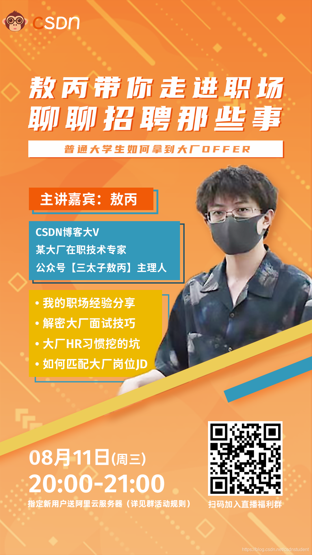 敖丙虽然才24岁,但已有五年的职场经验,并且这五年的职场打拼已帮助其实现了财富自由。其系列面试作品在B站及CSDN博客都拥有超高阅读量,帮助了无数职场新人。今晚,CSDN大咖直播邀请敖丙来到直播间,带你走进职场,聊聊招聘那些事。