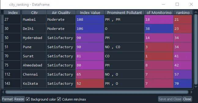 输出(city_ranking)显示了用户定义的城市的空气质量状况、指数、主要污染物、监测空气污染的监测站数量和排名。注:在用户定义的分析日期,AQI公报中没有与Bangalore和Vadodara有关的信息,因此没有显示在数据框中。