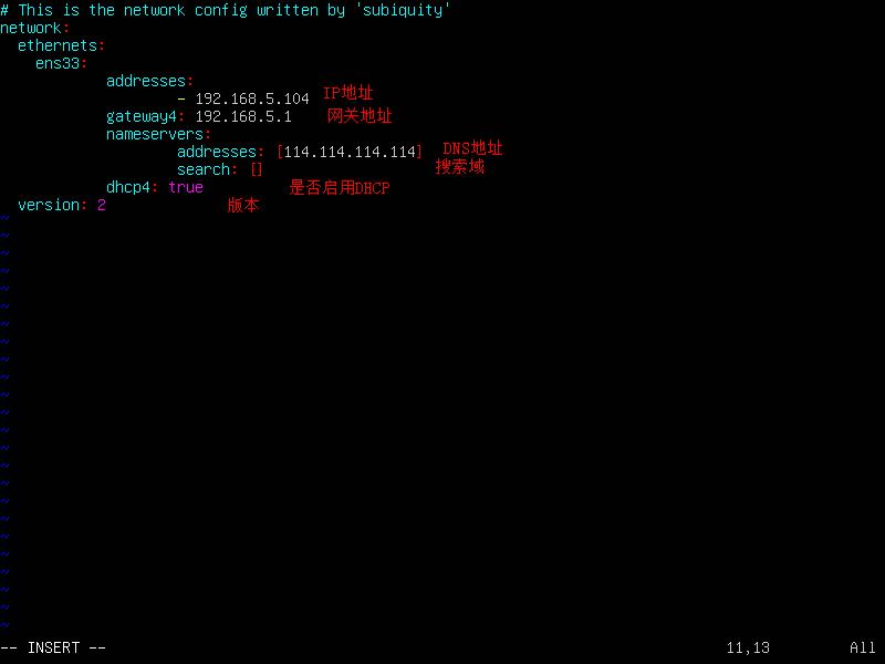 # This is the network config written by 'subiquity' network:ethernets:ens33:addresses:- 192.168.5.101/24gateway4: 192.168.5.1nameservers:addresses: [114.114.114.114]search: []version: 2 -