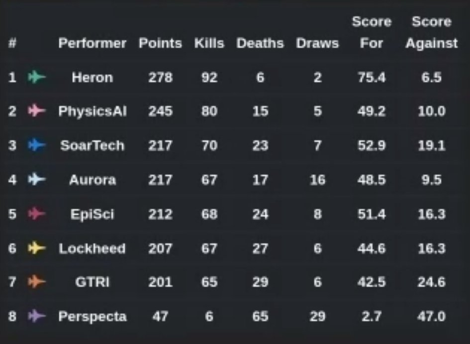 在今天(美国时间8月18日)举办的第一场比赛中,参赛的8支队伍分别和APL研发的5种对抗AI算法进行了比赛。获得前三名的分别为为Heron Systems, PhysicsAI 和 SoarTech。