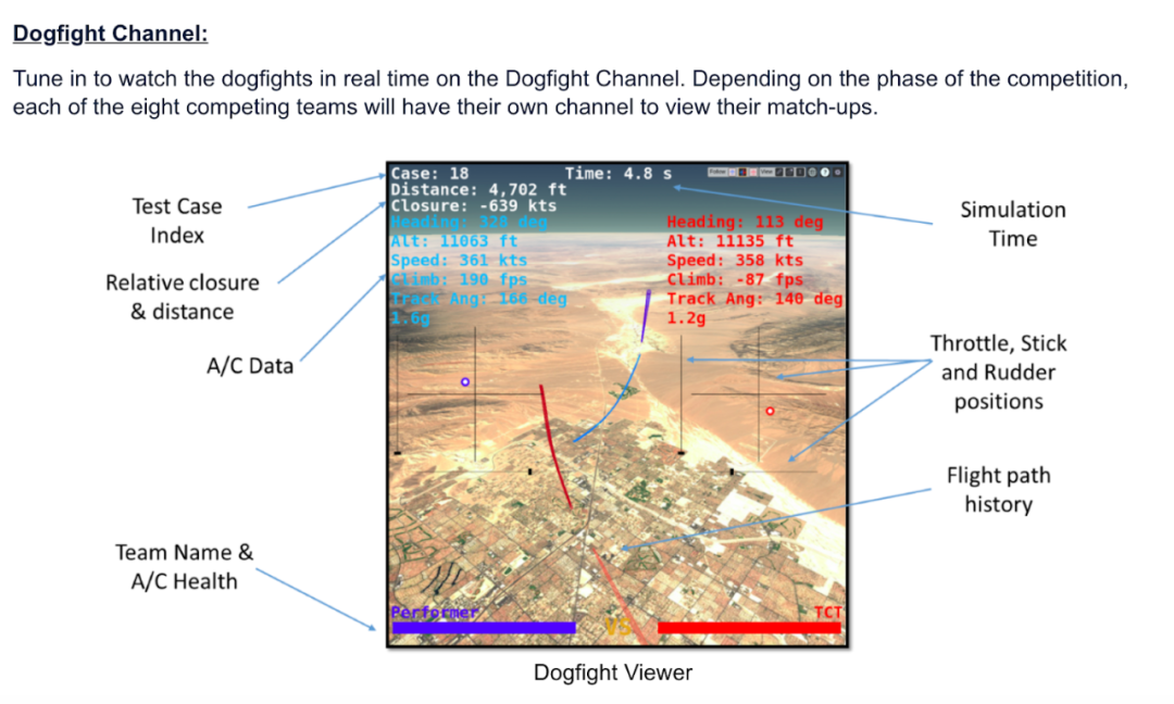 2019年8月,研究计划局选出了8支不同背景的队伍来参加测试,并且会参加24周的培训课程,旨在展示高级的AI算法是如何进行空中战斗的,这种战斗被称为'dogfight',也就是这个比赛的名称来源。这些比赛都是1对1开展的,并且会将对不同AI算法的优缺点评估汇报给ACE项目。能参赛并不意味着能加入ACE项目。