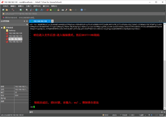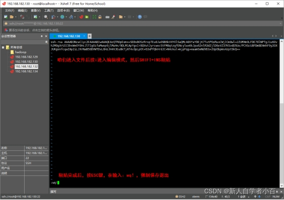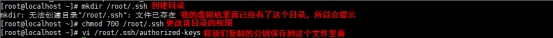 4.密钥生成完后,咱们打开虚拟机输入命令mkdir /root/.ssh 创建目录,因为我这个虚拟机已经有就,就会提醒我改目录已存在,然后我们在更改一个该目录的权限,最后再将我们刚才复制的公钥粘贴到/root/.ssh/authorized_keys文件里面 ![]()