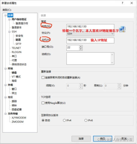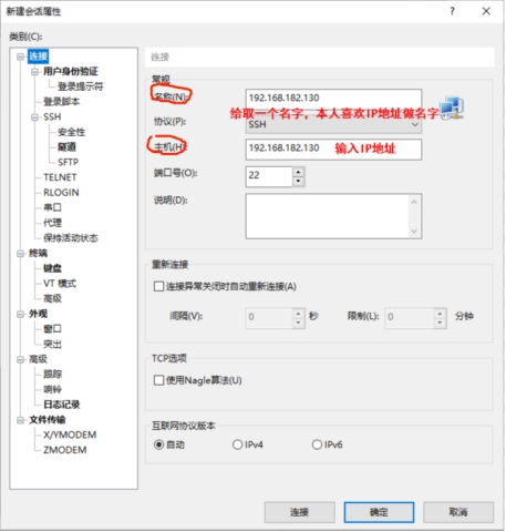 点击新建后,会出现一个新建会话属性框,咱们输入名称,输入主机ip地址