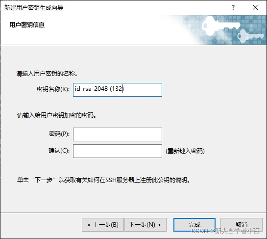 点击下一步后,需要设置密钥名称,密钥对密码,密码可以不设置,不过最好还是设置一下密码好一点,我这边没有设置密码,直接点击下一步