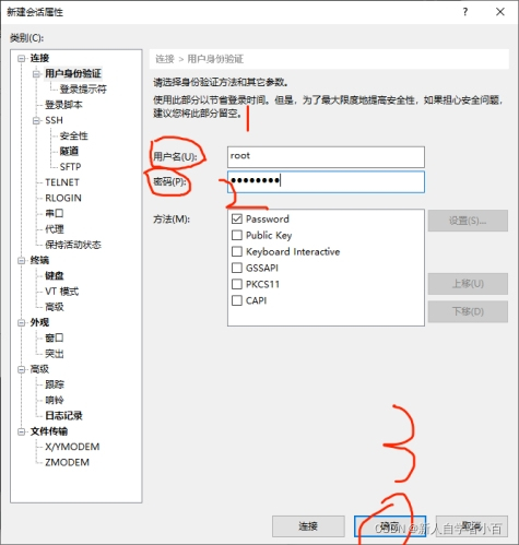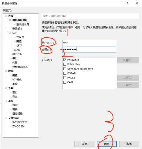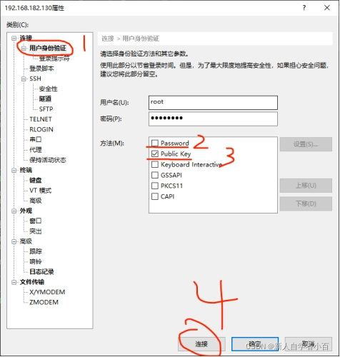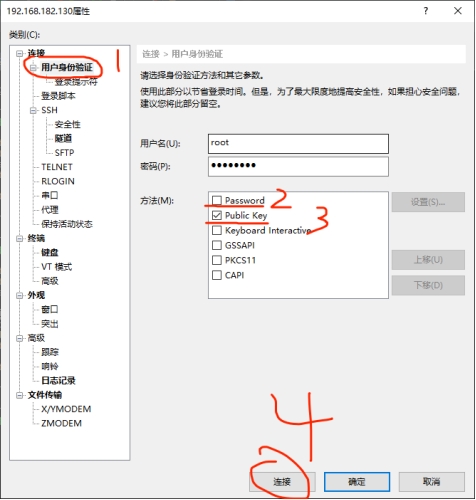 打开属性后,选择用户身份验证,将方法框里面的password的✓取消掉,将public Key勾选✓,最后点击连接就完成了