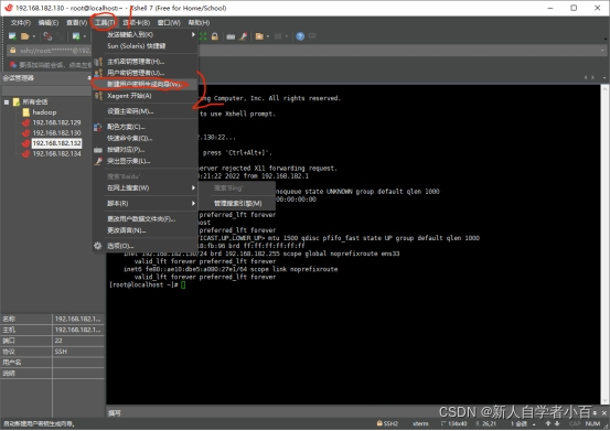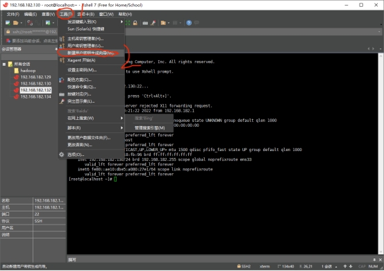 3. 咱们就利用Xshell远程登录上去了,接下来开始配置密钥,咱们点击工具,点击新建用户密钥生成向导