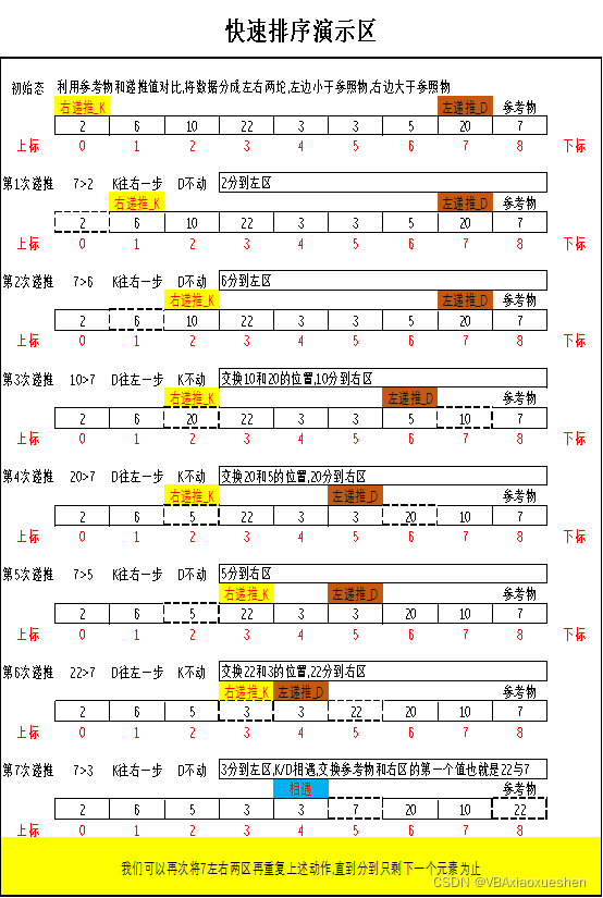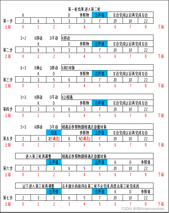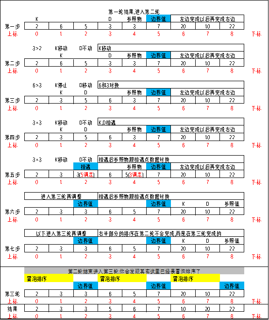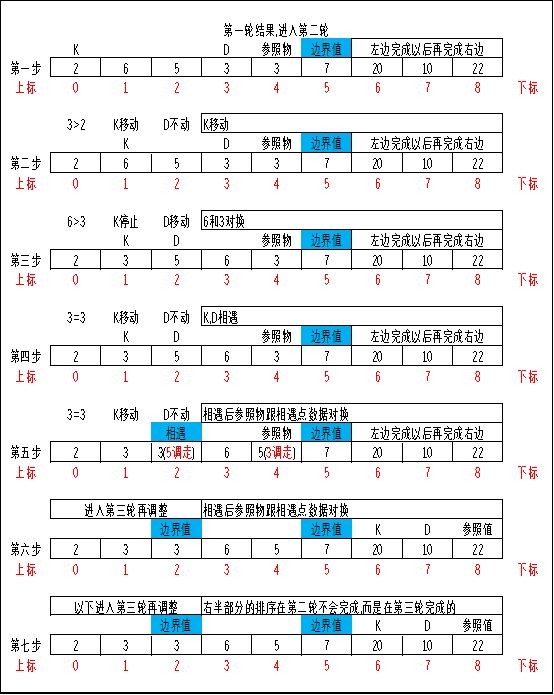 第三步先对比参考值和”右递推_K”指向的数字,如果小于等于参照值就往右移动一格,然后接着对比,否则停止移动,一旦”右递推_K”停止移动,他就和”左递推_D”指向的数据对换, ”