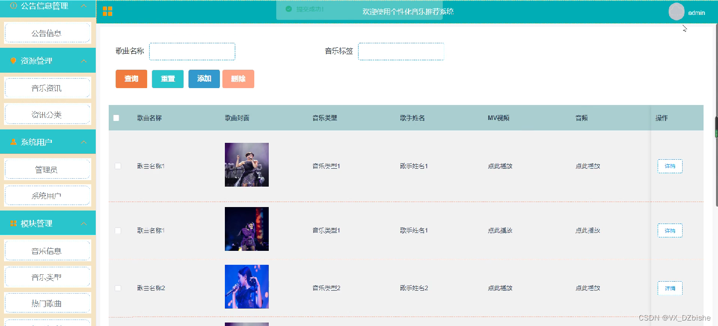 音乐标签,管理员在此页面可查看歌曲名称、歌曲封面、音乐类型、歌手名称、MV视频、音频等详细信息,可根据需要进行添加、删除、重置、查询等相应的操作如图5-7所示