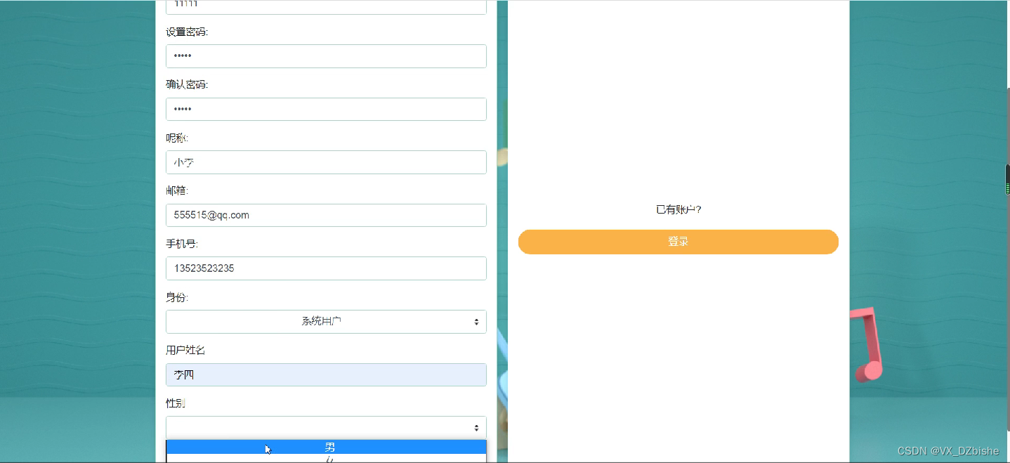 不是个性化音乐推荐系统中正式用户的是可以在线进行注册的,如果你没有本个性化音乐推荐系统的账号的话,添加“注册”,当填写上自己的账号+密码+确认密码+昵称+邮箱+手机号等后再点击“注册”按钮后将会先验证输入的有没有空数据,再次验证密码和确认密码是否是一样的,最后验证输入的账户名和数据库表中已经注册的账户名是否重复,只有都验证没问题后即可用户注册成功。注册成功后在登录页面输入用户名、密码、图片验证进行登录,如图5-8 5-9所示。