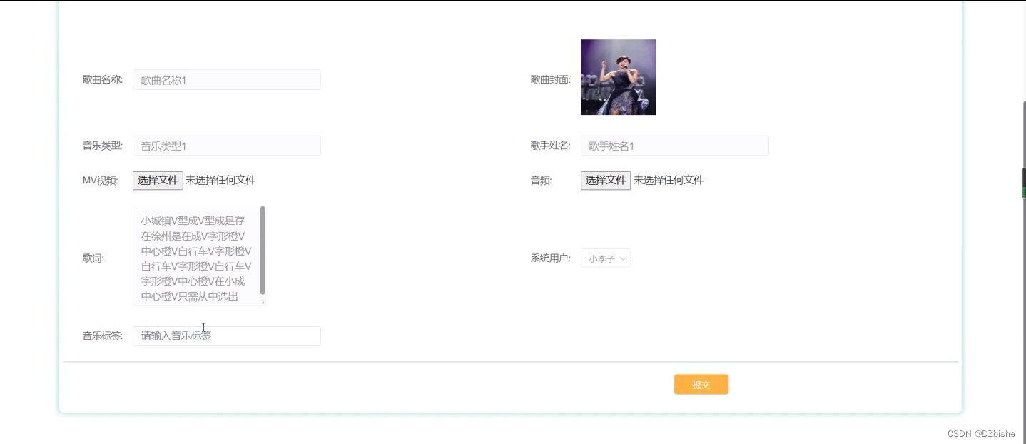 音乐标签,管理员在此页面可查看歌曲名称、歌曲封面、音乐类型、歌手名称、MV视频、音频等详细信息,可根据需要进行添加、删除、重置、查询等相应的操作如图5-7所示