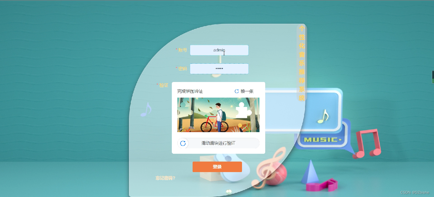 个性化音乐推荐系统,在系统登录页面管理员填写账号、密码等信息滑动滑块进行验证登录,如图5-1所示。