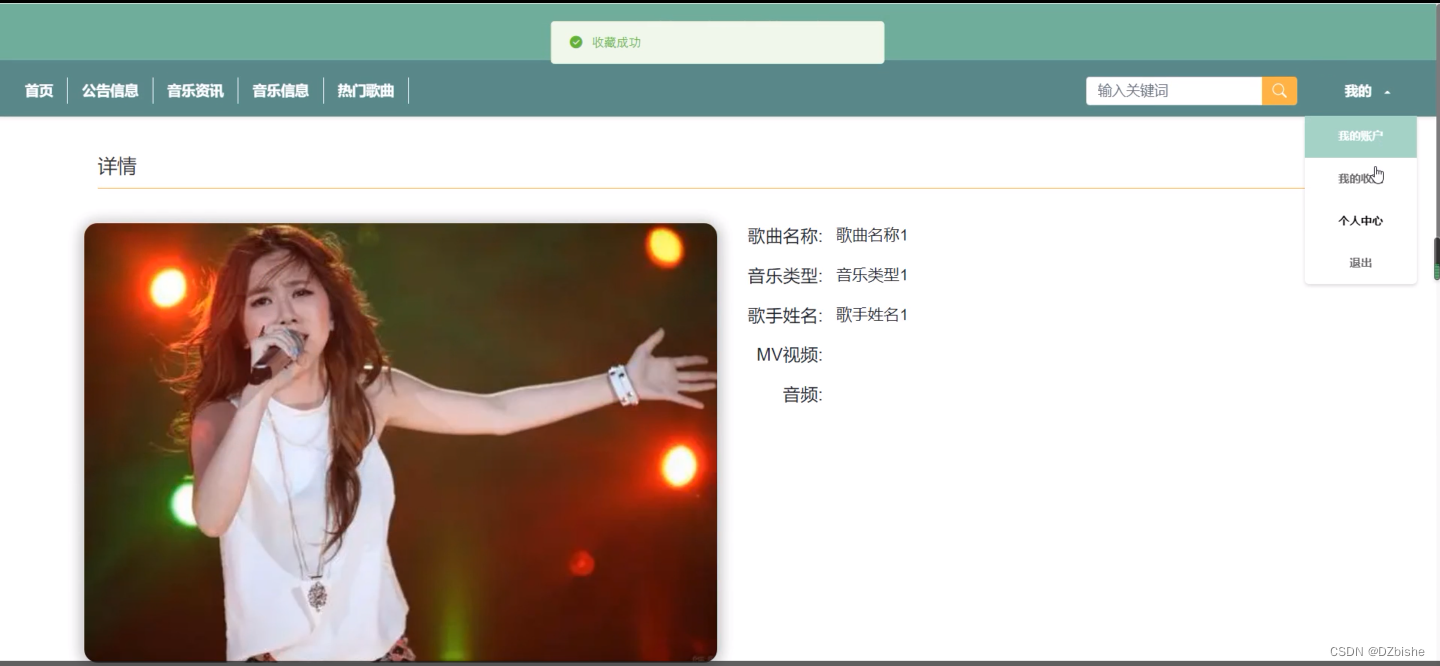 音乐信息:用户在此页面可通过关键字、音乐类型等方式搜索查看音乐详细信息,比如:歌曲名称、音乐类型、歌手姓名、封面图片、MV视频、音频、歌词等信息,并可进行点赞、收藏、评论或打标签等操作,打标签的歌曲可在后台查看,如图5-10 5-11 5-12所示。