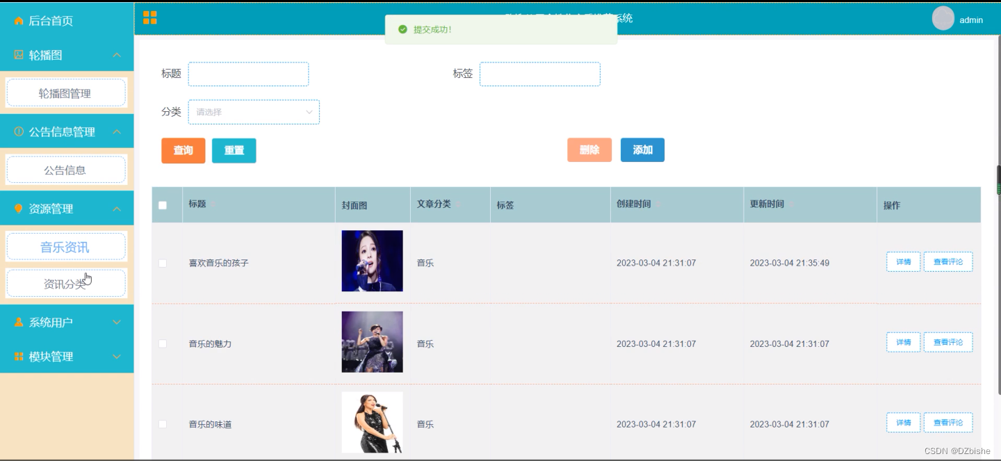 个性化音乐推荐系统中的管理人员在“资源管理”这一菜单下主要是对音乐资讯以及音乐资讯所属的分类进行管控,包含了用户对音乐资讯提交的评论信息,如图5-4所示。