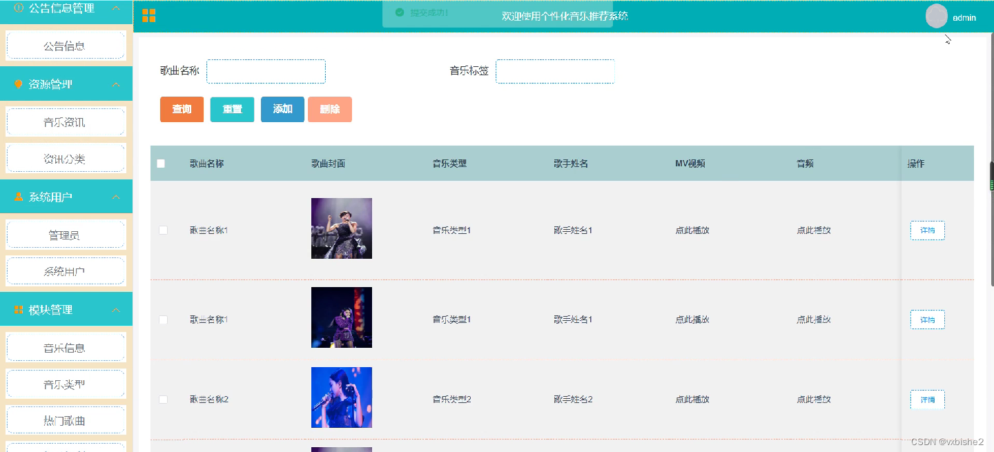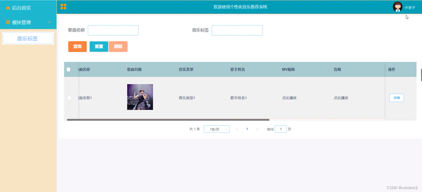 音乐标签,管理员在此页面可查看歌曲名称、歌曲封面、音乐类型、歌手名称、MV视频、音频等详细信息,可根据需要进行添加、删除、重置、查询等相应的操作如图5-7所示
