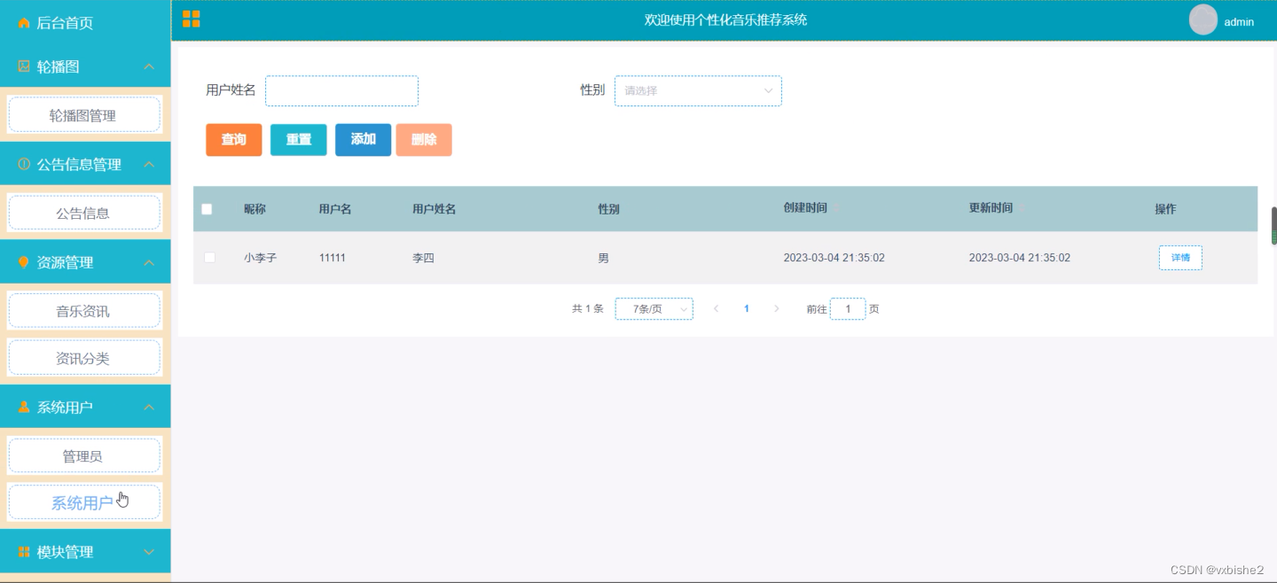 个性化音乐推荐系统中的管理员在“系统用户管理”这一菜单是中可以对注册的用户以及管理员人员进行管控,如图5-3所示。