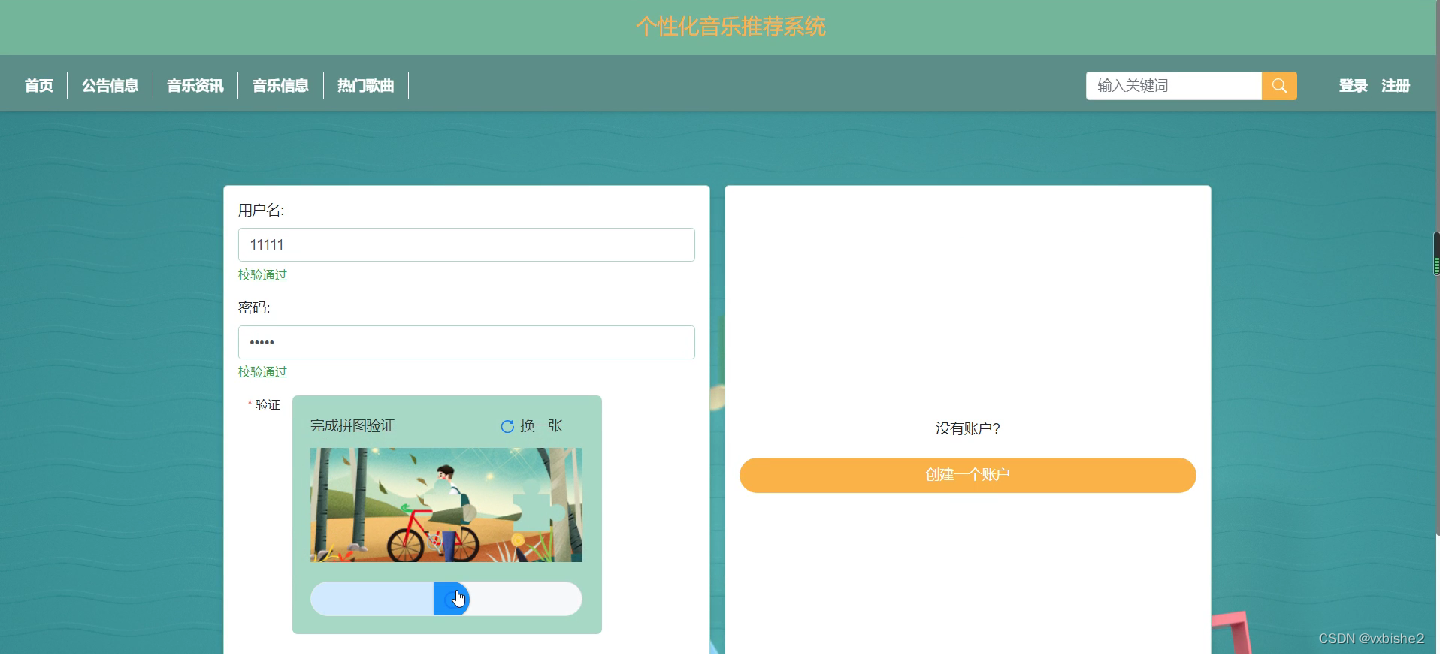 个性化音乐推荐系统,在系统登录页面管理员填写账号、密码等信息滑动滑块进行验证登录,如图5-1所示。
