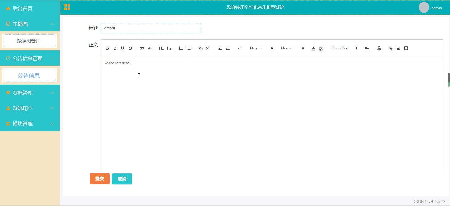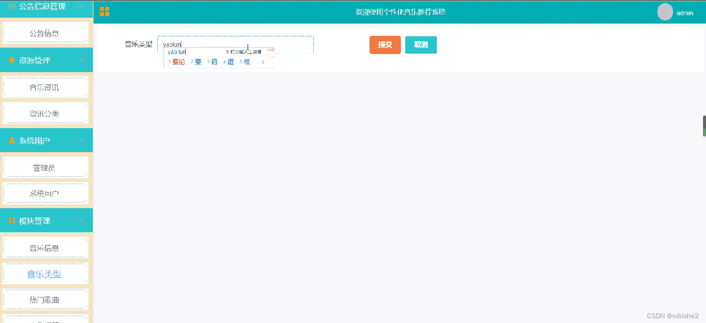 管理员登录进入个性化音乐推荐系统之后,就可以对所有的信息进行查看,可以查看到后台首页、轮播图、公告信息管理、资源管理(音乐资讯、资讯分类)系统用户(管理员、系统用户)模块管理(音乐信息、音乐类型、热门歌曲、音乐标签)等功能模块;并且还可以对其进行相应的操作管理,如图5-2所示。