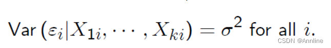 Assumption 5: Homoscedastic errors. That is, given any values of (X1i, · · · , Xki) the error terms εi have a constant variance that does not depend on i :