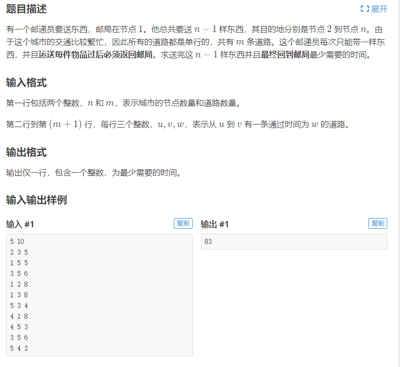 {int n,m;cin>>n>>m;memset(h,-1,sizeof h);for(int i=1;i<=m;i++){scanf("%d %d %d",&u[i],&v[i],&t[i]);add(u[i],v[i],t[i]);}dijkstra(1);long long ans=0;for(int i=1;i<=n;i++)ans+=d[i];idx=0;memset(h,-1,sizeof h);for(int i=1;i<=m;i++)add(v[i],u[i],t[i]);dijkstra(1);for(int i=1;i<=n;i++)ans+=d[i];printf("%lld",ans);return 0;