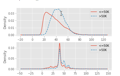 income['hours-per-week'][income.income == ' <=50K'].plot(kind = 'kde', label = '<=50K', ax = axes[1], legend = True, linestyle = '-')