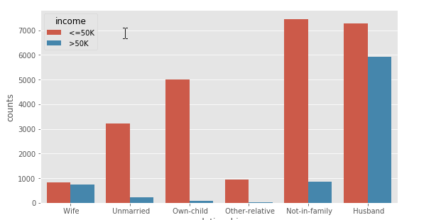 relationship = pd.DataFrame(income.groupby(by = ['relationship','income']).aggregate(np.size).loc[:,'age'])