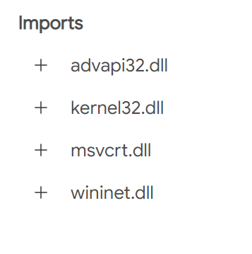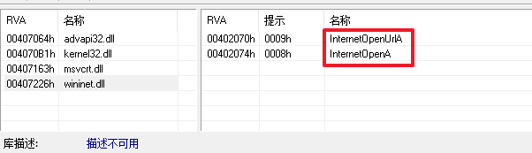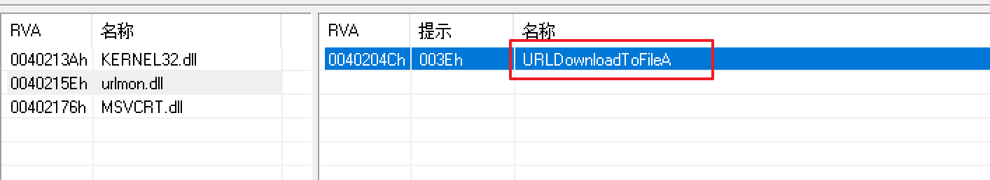看一些导入表内容, 其中最精彩的就是URLDownloadToFileA函数,代表其从远程服务器上下载了东西下来, 很可能就是从上面的url上下载: