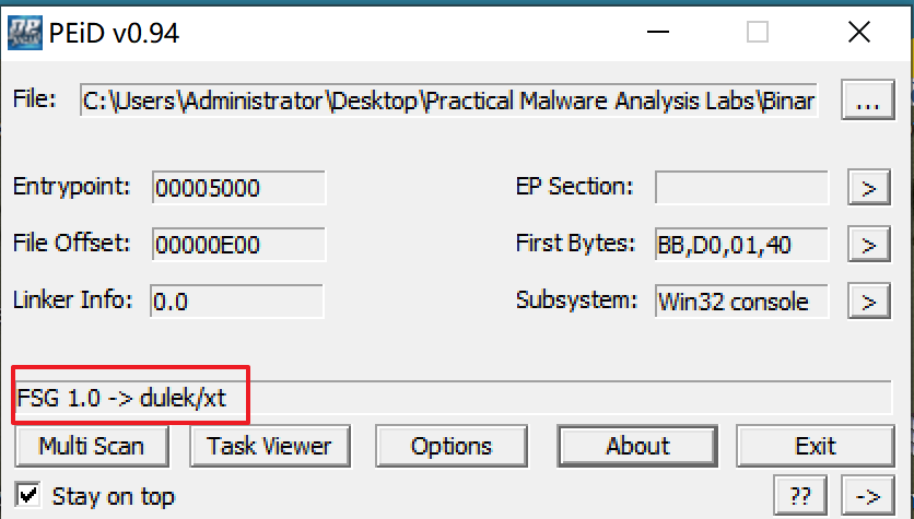 其加上了一个FSG 1.0的壳。没有碰到过这个壳。尝试手脱, 先查看下各个表: